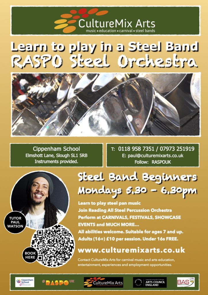 Join our weekly steel band beginner workshops in Slough where you can learn to play steel pan music with RASPO.
